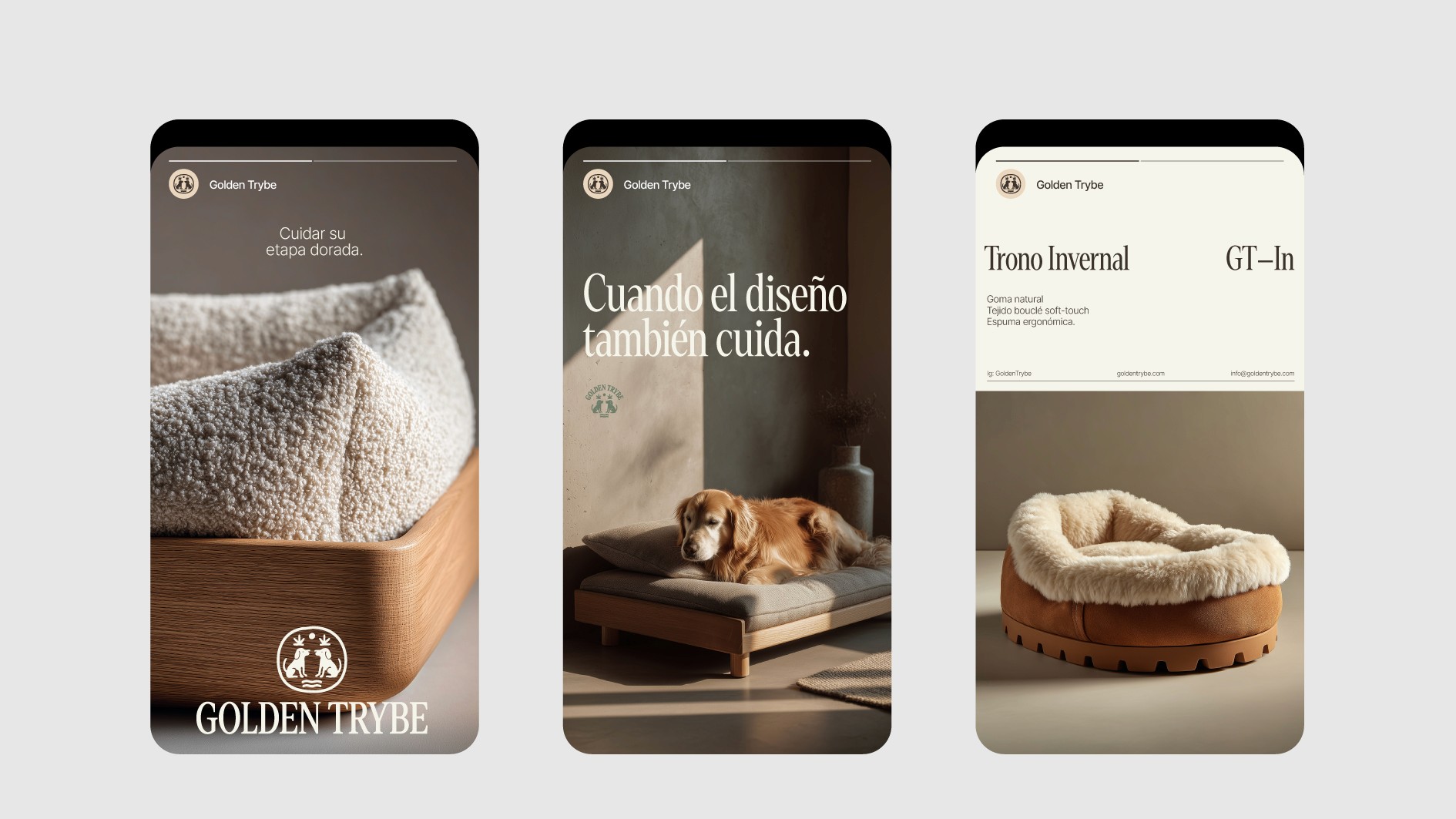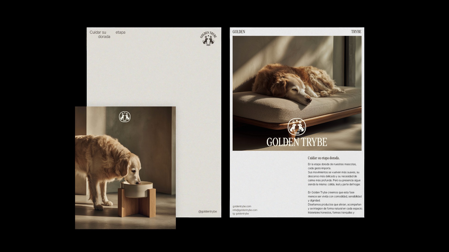 We helped Golden Trybe move away from generic pet branding by building a calm, premium system focused on senior dogs. Through photography, materials, typography and tone of voice, we created an identity where care is present without being explicit, and where the dog remains the protagonist without sacrificing elegance. The result is a brand that feels warm, considered and credible — designed to last and scale.